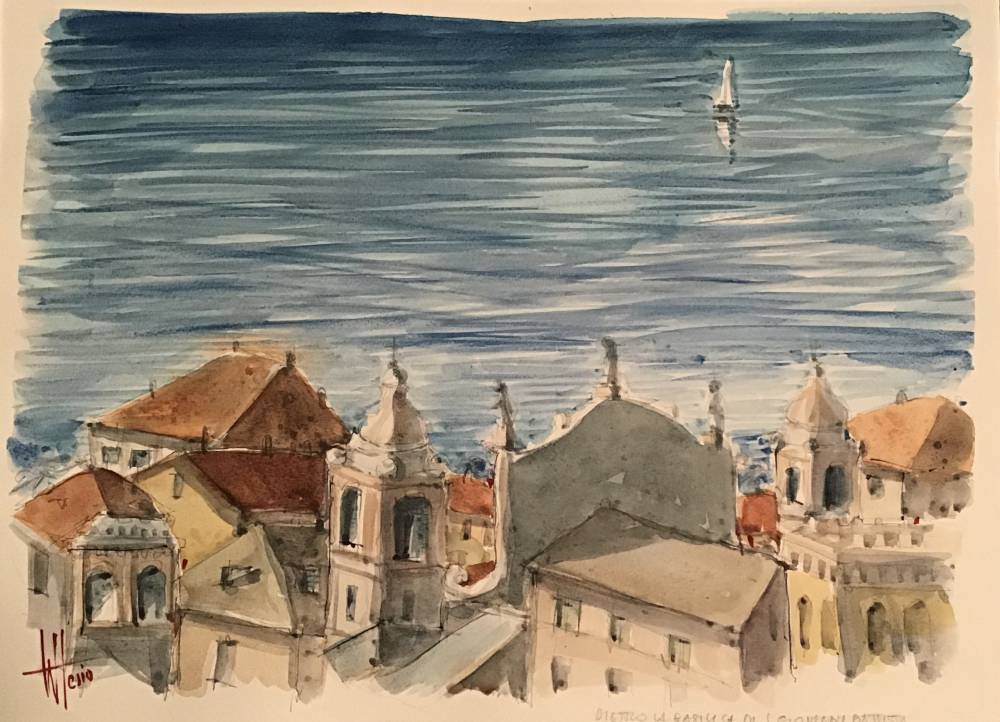 Poi ho iniziato a sognare di essere altrove, nella mia bella Finale Ligure, che adoro d’estate come d’inverno. La mia mano ed i miei pennelli hanno cominciato a distribuire sulla carta le immagini di quei luoghi. Sono approdato verso il porto,